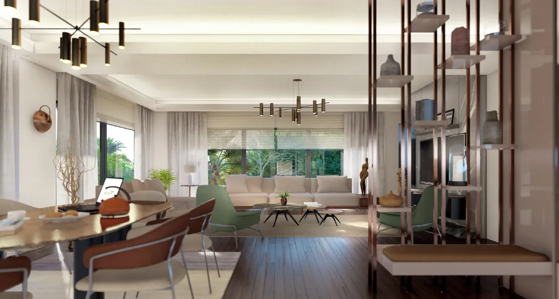 ♦ 4 غرف إضافية (غرفة خادمة وصالون سينما وصالة ألعاب رياضية وغرفة تخزين.)